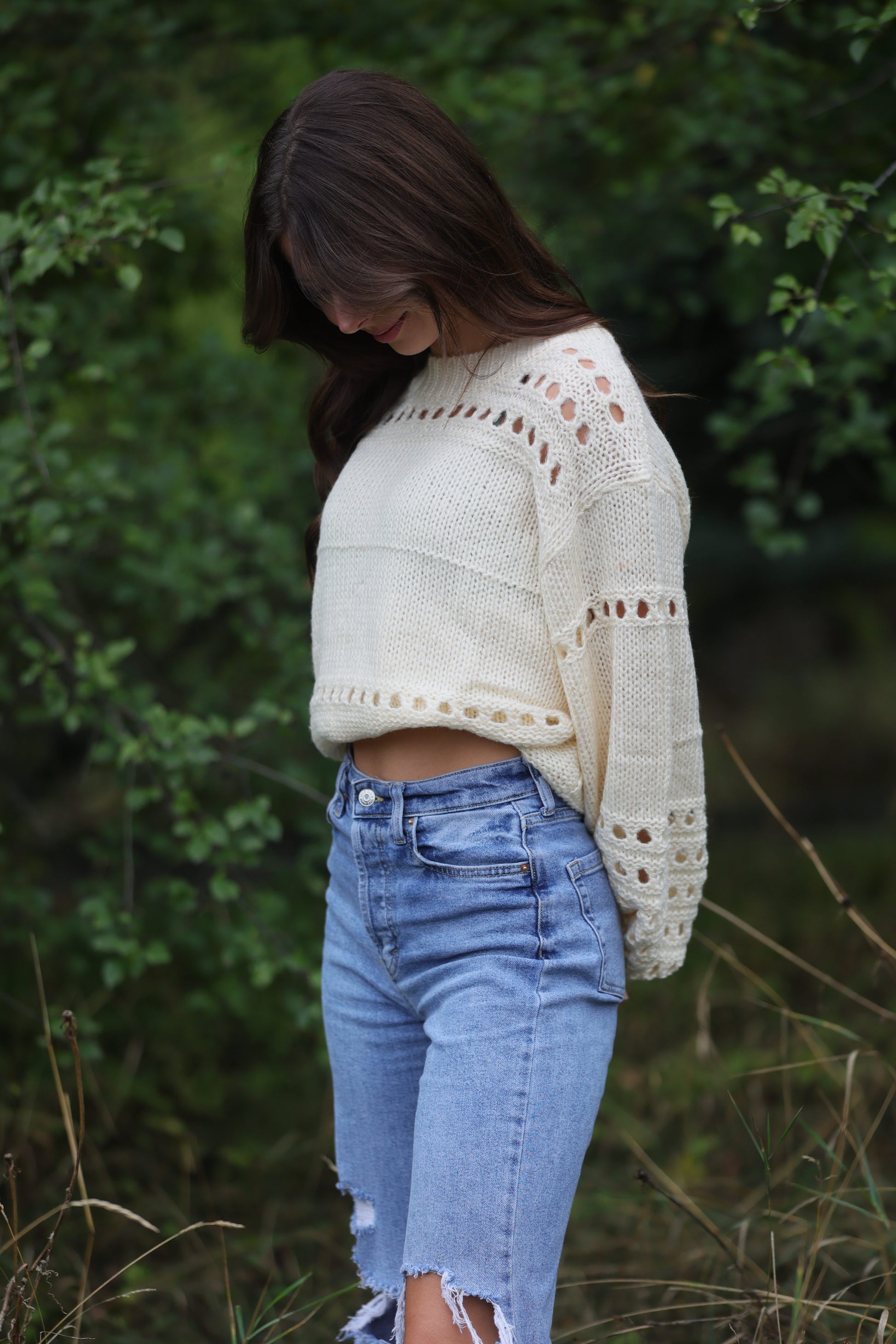 BALLON SLEEVE OPEN KNIT SWEATER